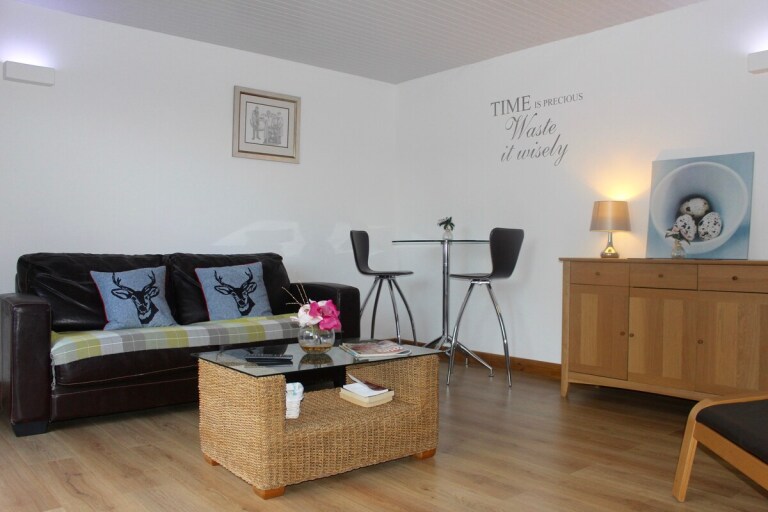 It has two bedrooms which can sleep up to five guests, the bed configuration is 2 singles in the first room and a double and a single in the second room The decor is light and airy throughout with a well equipped kitchen and cosy lounge.